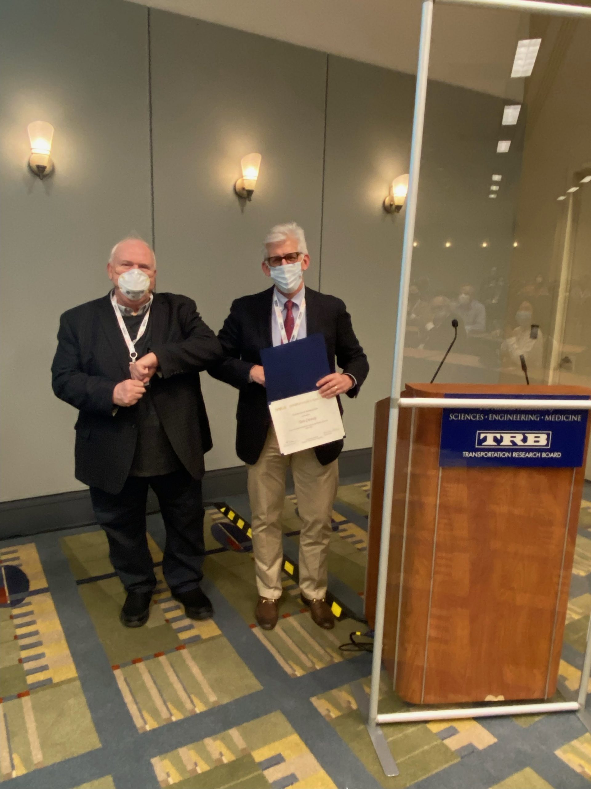 Outgoing chair Tom Creasey receiving recognition from TRB’s Rich Cunard for his six years of service as chair.