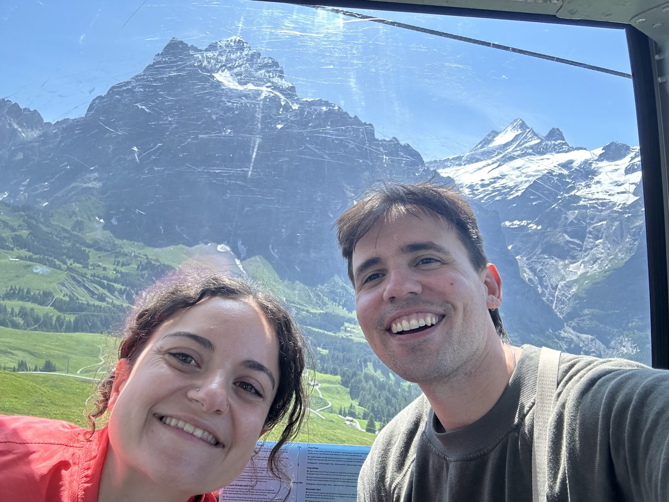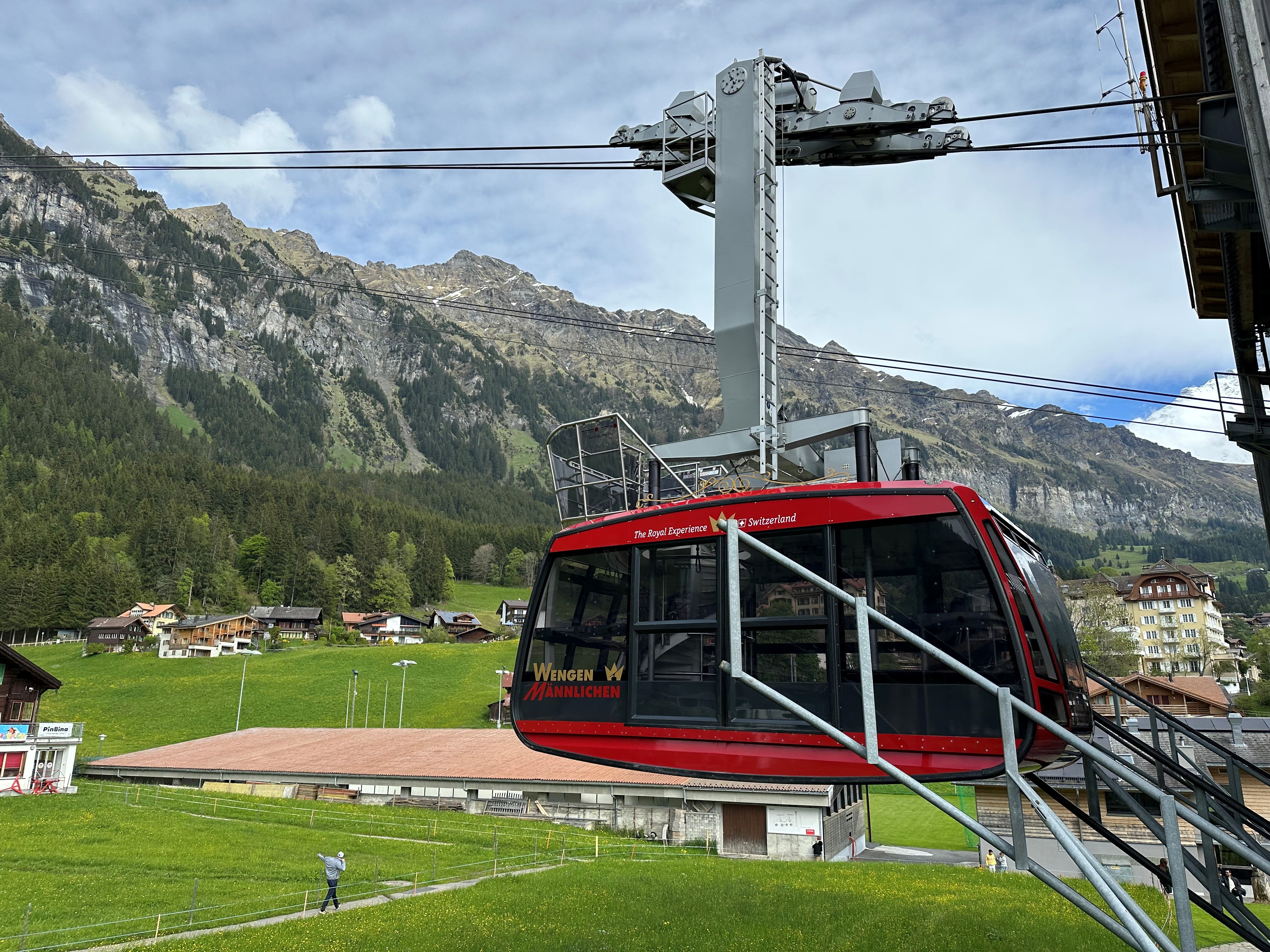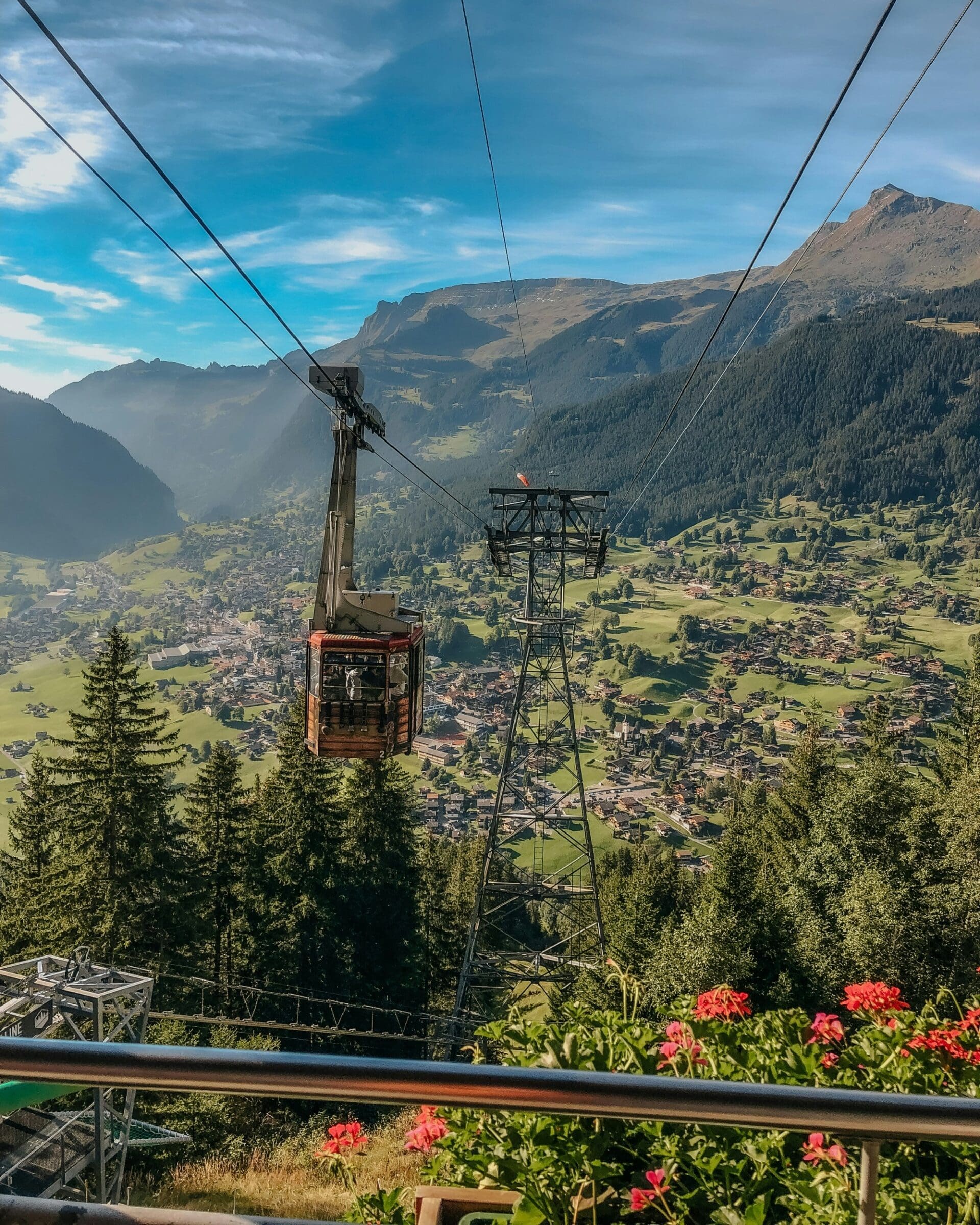 A cable car descends into a Swiss alpine valley. Farmers and tourists alike use these gondolas for trips of all kinds between high fields and low towns. Photo credit: Logan Gouget, Unsplash.