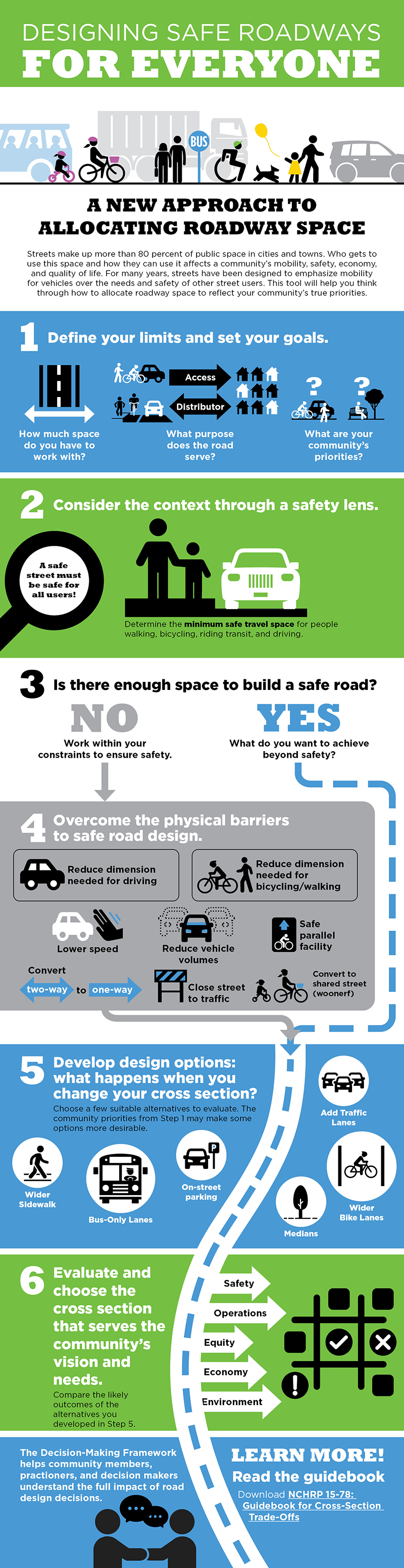 Step six compares the outcomes of all previous stages and allows for a determination of a cross section that will serve the needs of the users and provide a minimum standard of safety. In-depth guidance and ideas follow each step to help make complicated decisions about roadway safety and design easier to understand and navigate.