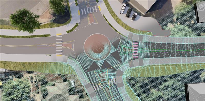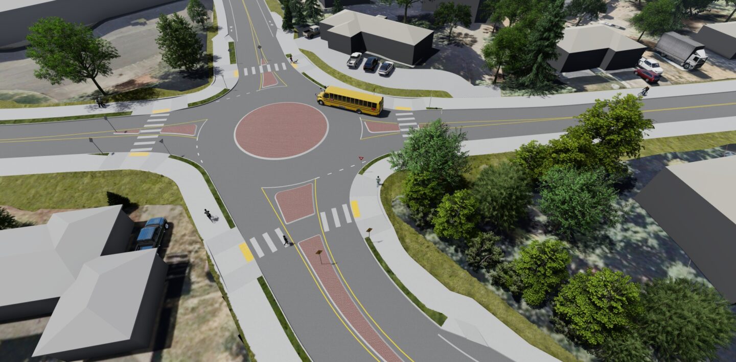 Our civil design team developed detailed corridor models in Civil 3D, including proposed surfaces, curb lines, and grading. This allowed for accurate cost estimates and a better understanding of how road widening would impact the surrounding area. A rendering process was layered into the workflow to create an animated scene complete with vegetation, school bus operations, and people walking and biking through the future corridor.